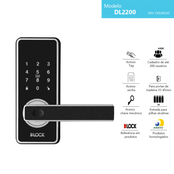 Fechadura digital da marca DLock tem capacidade para cadastrar até 200 usuários, com design avançado, ela conta com um painel digital touchscreen, ideal para escritórios e residências com função Stand Alone que funciona somente com pilhas, sem depender de energia elétrica. Os modos de acessos são: Senha, Tag, e Chave Mecânica, ideal para quem quer viver com praticidade no seu dia a dia. Além dessas funções, sua fechadura conta com trava de segurança em aço com alerta sonoro de pilha fraca para avisá-lo sobre a necessidade de troca de suas pilhas. Ela também possui uma porta mini USB para dar carga de emergência em caso de falta de pilha, possibilitando sua entrada mesmo após avisá-lo alguns meses de pilha fraca, dependendo do seu uso. Mesmo quando você troca suas pilhas, sua Memória Flash não deixa você perder os cadastros da sua fechadura para sua comodidade. O Adesivo anti-risco protetor, serve para proteger sua fechadura até a sua instalação e configuração. Pelo seu teclado digital touchscreen, as senha e Tags são configurados na própria fechadura. A fechadura lhe propõe mais segurança sendo tipo de instalação embutir.