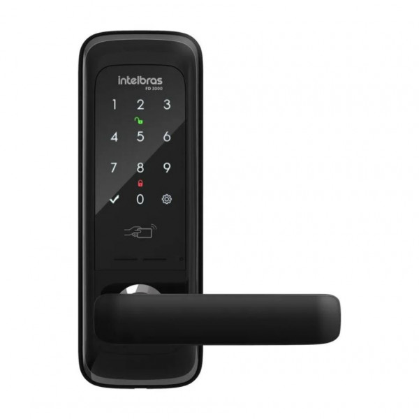 A fechadura digital de embutir FD 3000 faz parte da nova linha de fechaduras digitais Intelbras, que combina segurança e praticidade. Possui duas formas de acesso: senha e tag de proximidade. Na FD 3000 é possivel cadastrar até 9 senhas (sendo 1 de administrador, 4 de uso diário e 4 de visitantes de uso temporário) e até 100 tags de proximidade. Conta com funções como travamento automático, função não pertube, aviso de bateria fraca, sensor de travamento automático e alarme antiarrombamento. Com a função Trava de Segurança é possível travar a maçaneta pelo lado de dentro para evitar que as crianças saiam sem permissão. Sua alimentação é feita por 4 pilhas alcalinas tipo AA, com duração média de 1 ano. A FD 3000 tem 02 anos de garantia de fábrica e é indicada para portas com espessura de 35mm a 70mm.